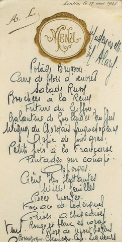 C'est la première photo de Marguerite et Lucien prise à Rodez. On n'a pas de photo de la fête, c'était encore la guerre... Seul souvenir : le menu, vous pouvez juger de la fête !